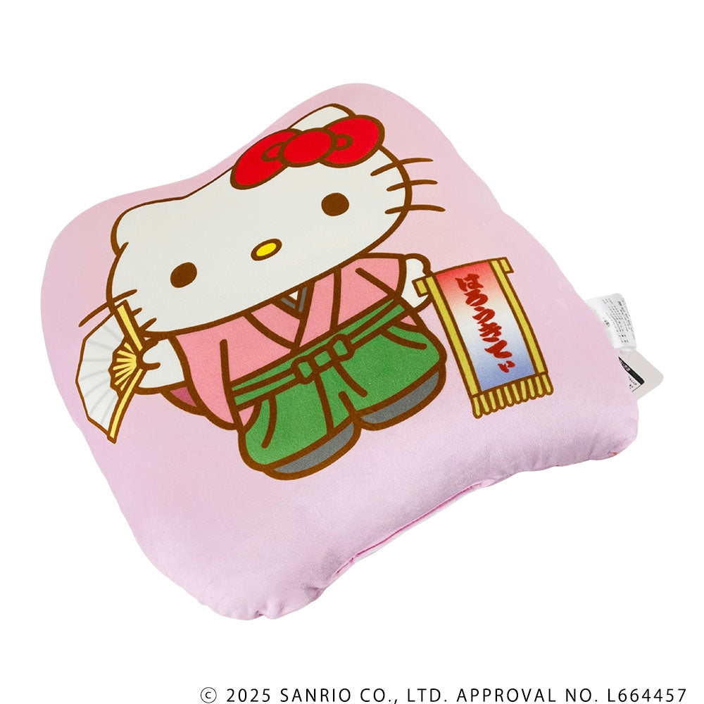 呼出しの裁着袴(たっつけばかま)を身に着けたハローキティがキュートなデザインのダイカットクッション。思わずだきしめたくなる手触りです。