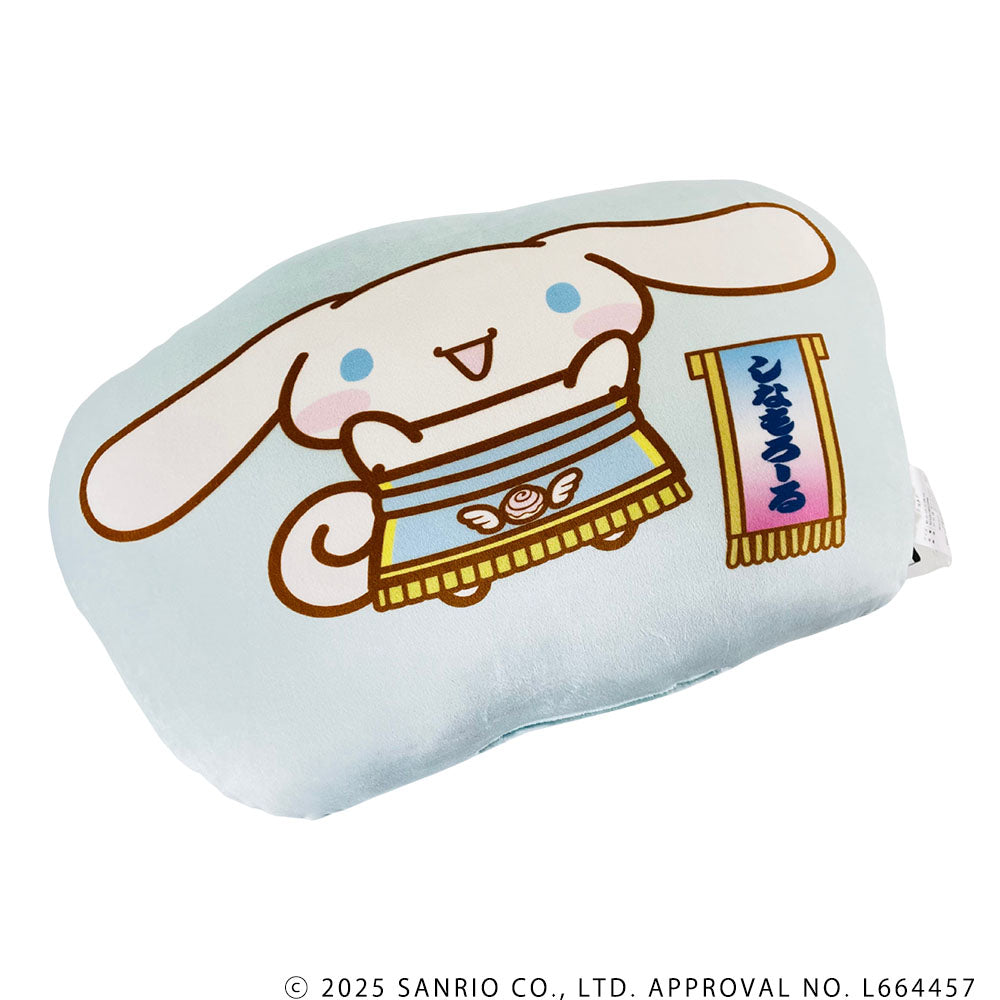 化粧まわしを身に着けたシナモロールがキュートなデザインのダイカットクッション。思わずだきしめたくなる手触りです。