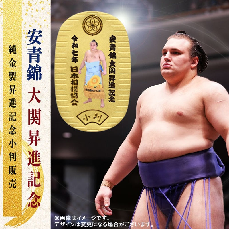 大関に昇進した安青錦の化粧まわし姿を純金製の小判としてお手元に残しませんか。