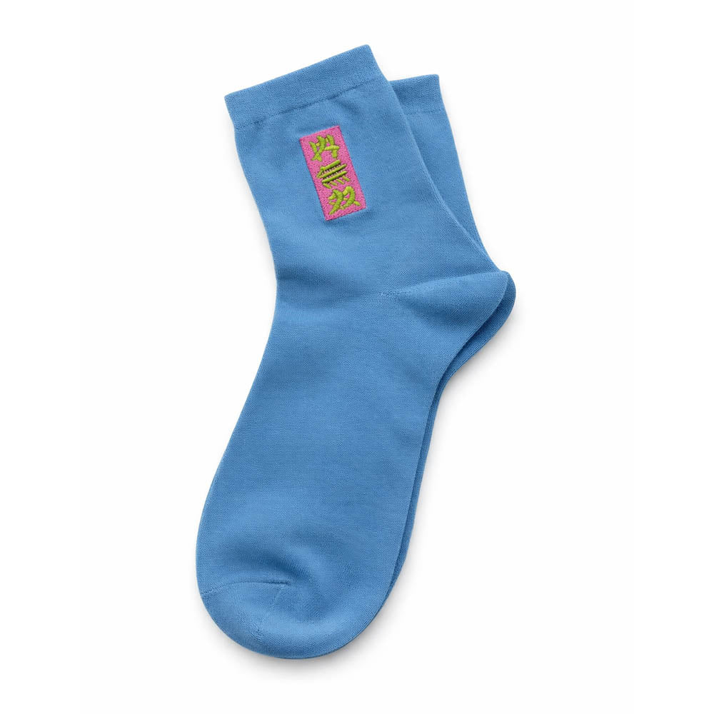 足にまつわる決まり手を刺繍した靴下。相手の内ももを下から手で払い、体をひねって相手を倒す「内無双」モチーフです。