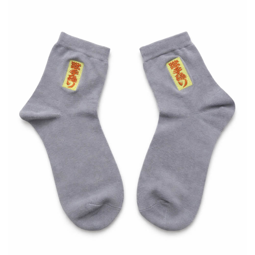 足にまつわる決まり手を刺繍した靴下。体を開いて相手の足を内側から外に蹴り、肩などを叩くか、手をたぐって前に倒す「蹴手繰り」がモチーフです。