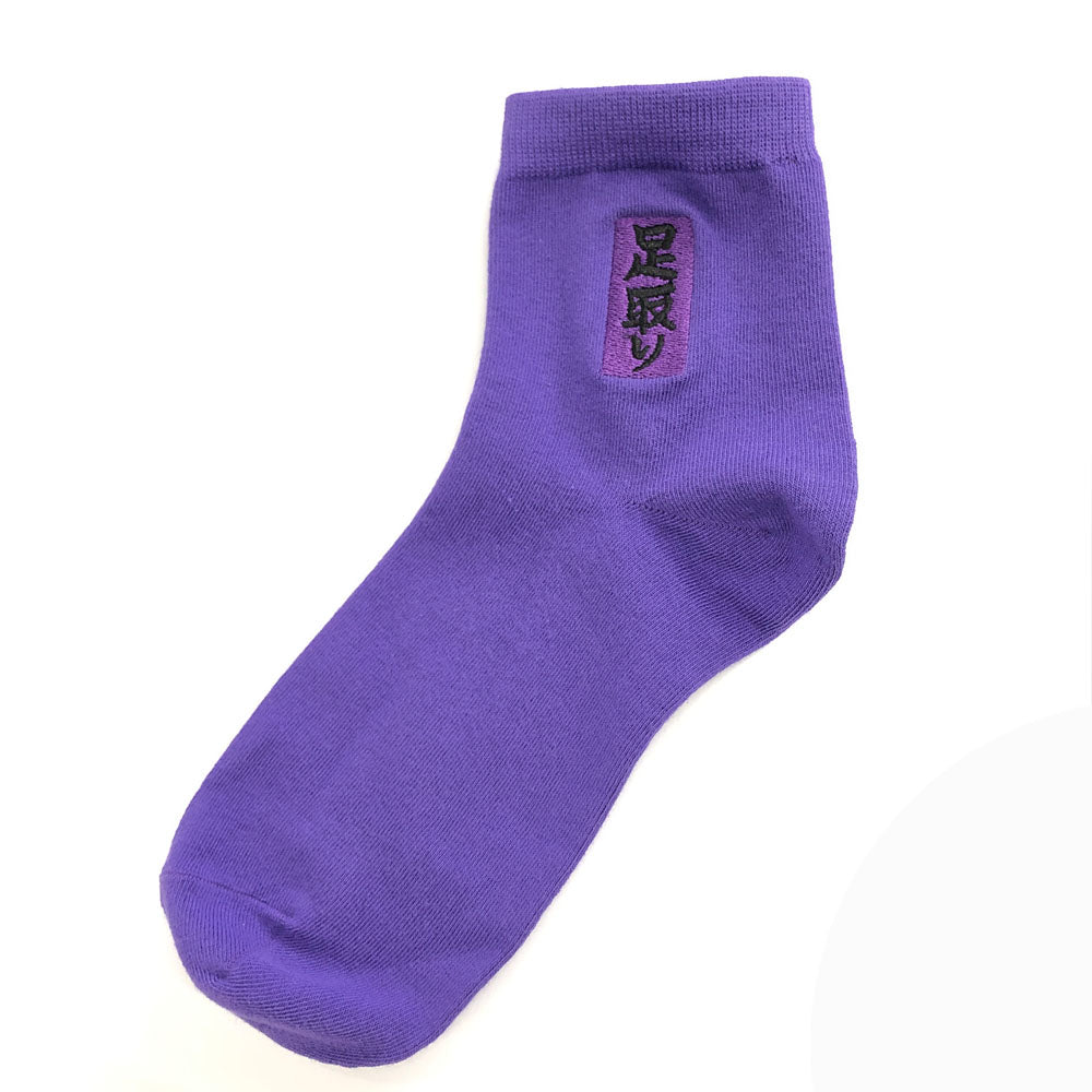 足にまつわる決まり手を刺繍した靴下。相手の下にもぐり込み、両手で相手の片足を抱えて倒す「足取り」がモチーフです。